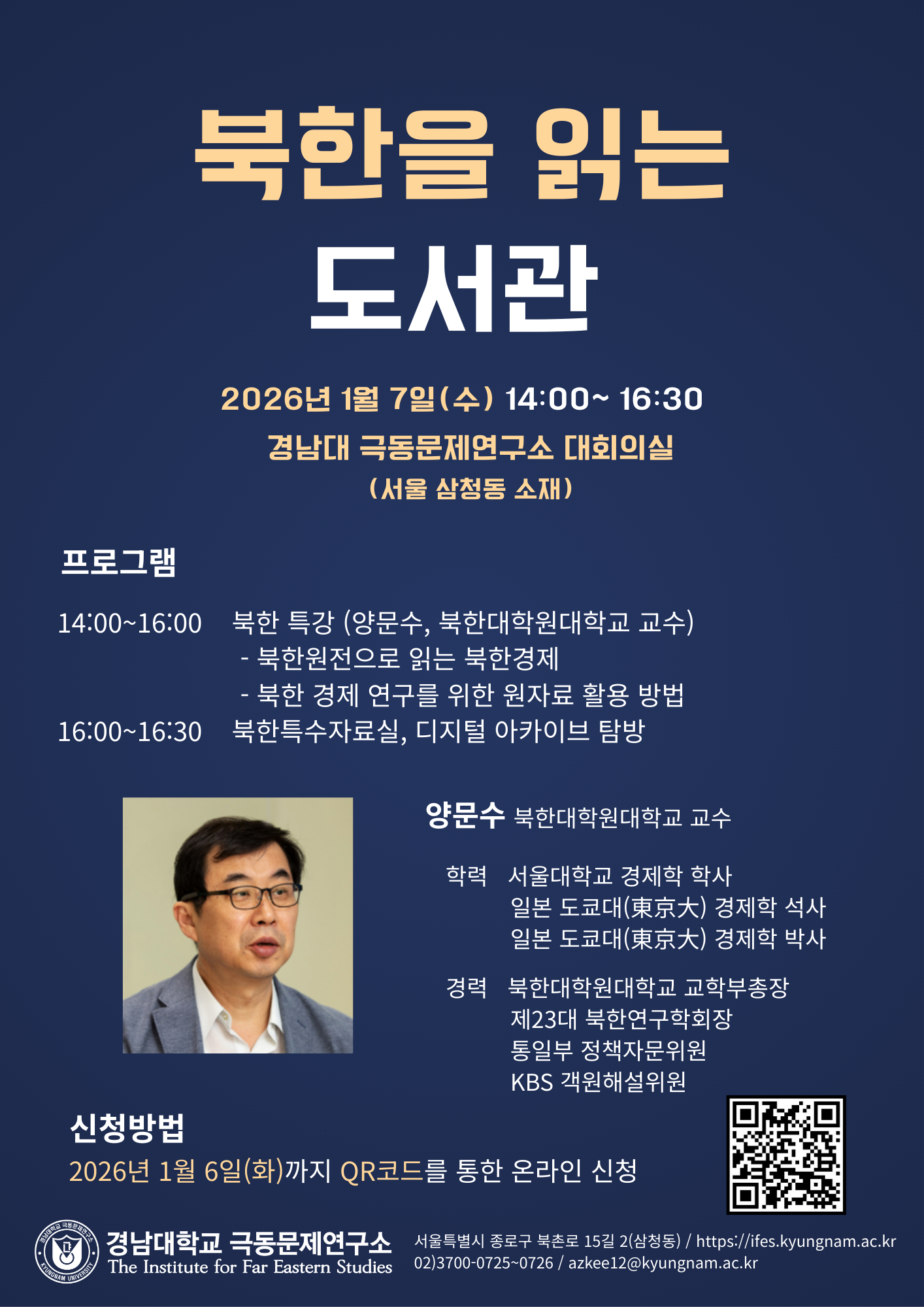 이번에 진행되는 제3차 『북한을 읽는 도서관』은 “북한원전으로 읽는 북한경제”를 주제로 마련되었습니다. 북한 경제 분야의 주요 원전 자료를 소개하고, 전문가의 해설을 통해 북한 경제 연구를 위한 원자료 활용법과 접근 방법을 깊이 있게 이해할 수 있는 기회를 제공합니다.이 프로그램은 평소 접하기 어려웠던 북한 자료에 대한 이해를 높이고, 북한·통일 연구의 기반을 확장하는 데 목적이 있습니다. 북한 연구에 관심 있는 대학(원)생과 연구자, 그리고 일반 참가자 모두 환영합니다.