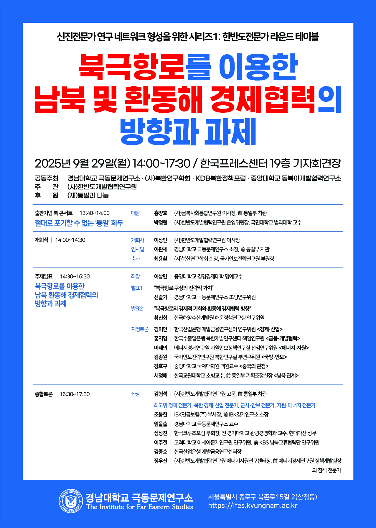 • (사)한반도개발협력연구원은 2025년 9월 29일(월) 오후 2시부터 5시 30분까지 한국프레스센터 19층 기자회견장에서 경남대 극동문제연구소, (사)북한연구학회, KDB북한정책포럼, 중앙대 동북아개발협력연구소와 공동으로 「한반도 전문가 라운드테이블」을 개최했다. 이번 행사는 (재)통일과 나눔이 후원했다.