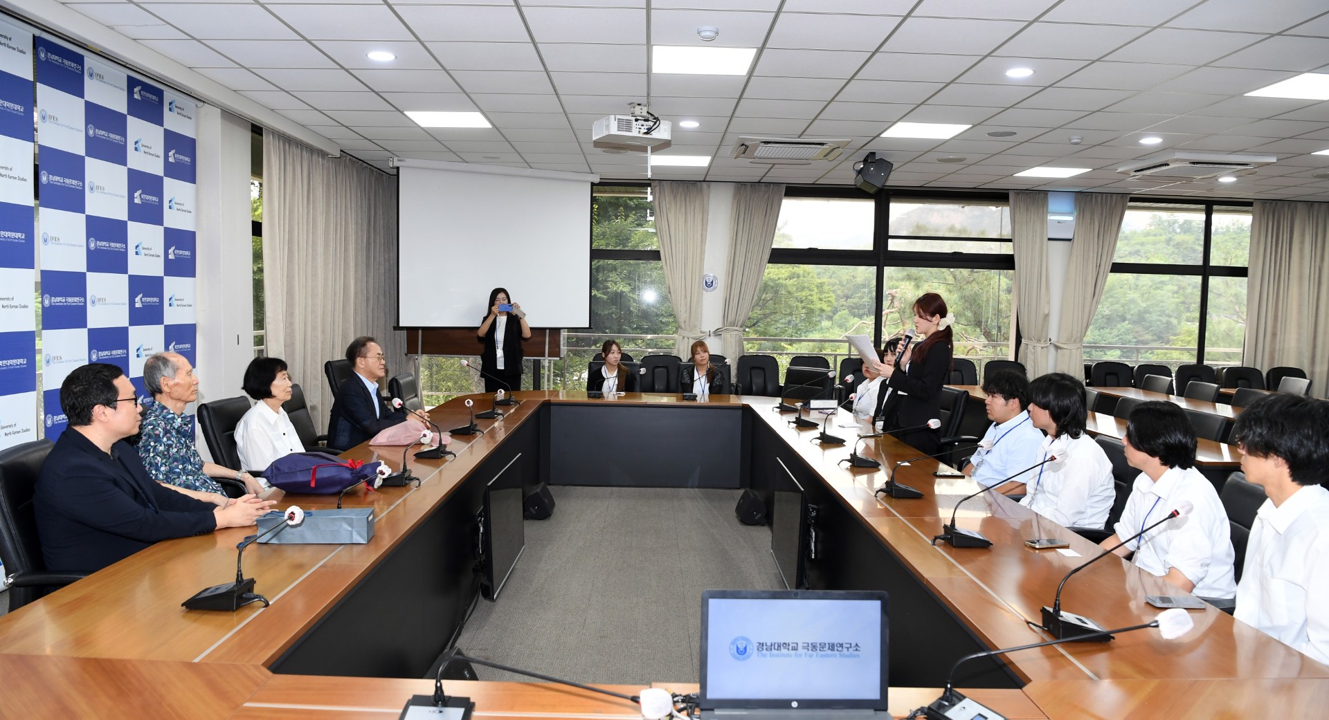 연구소를 방문한 학생들은 박재규 경남대 총장, 김선향 북한대학원대 이사장, 박정진 경남대 특임부총장, 이관세 경남대 극동문제연구소장 등을 접견하고 준비해온 편지와 선물을 증정하였다.