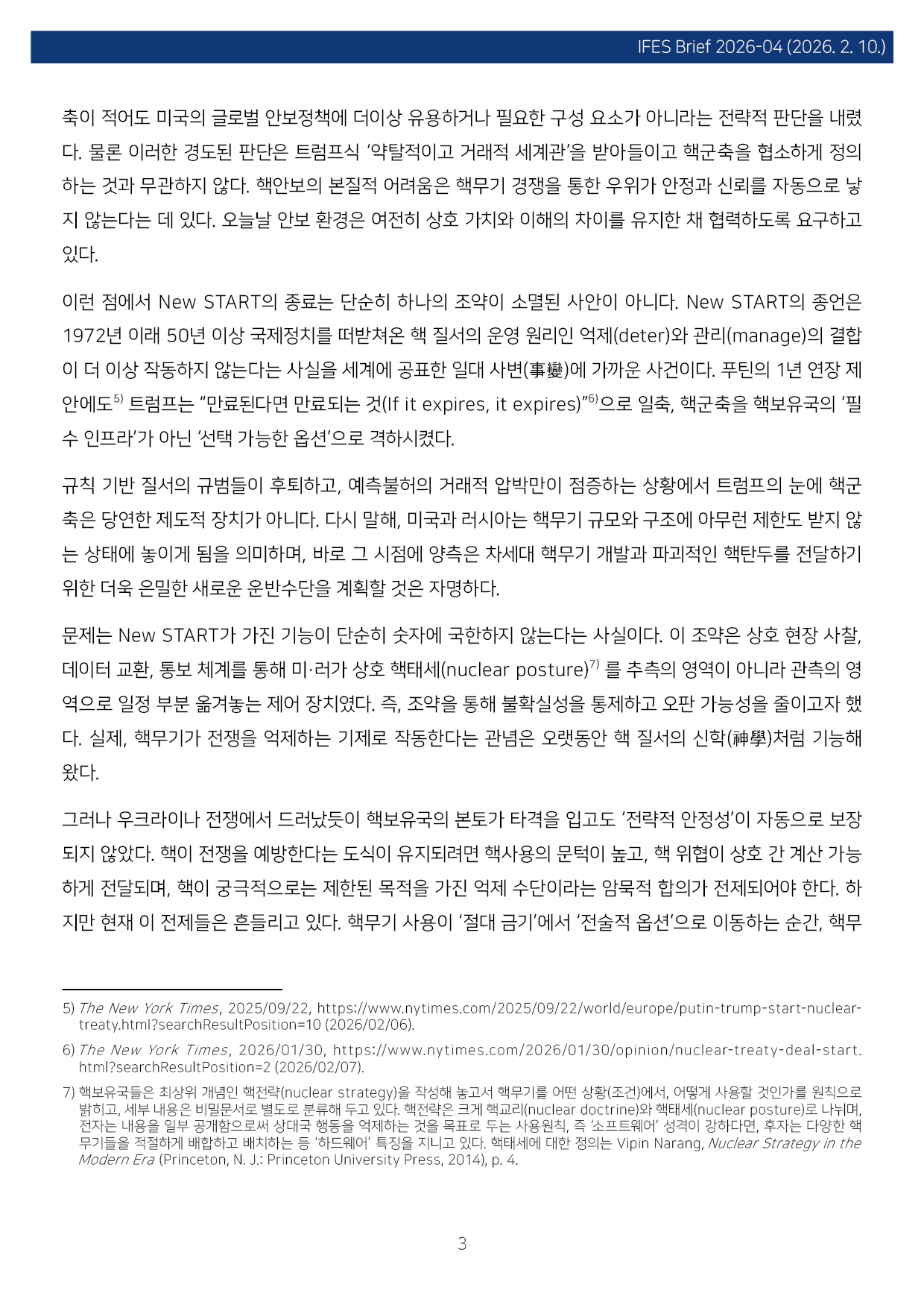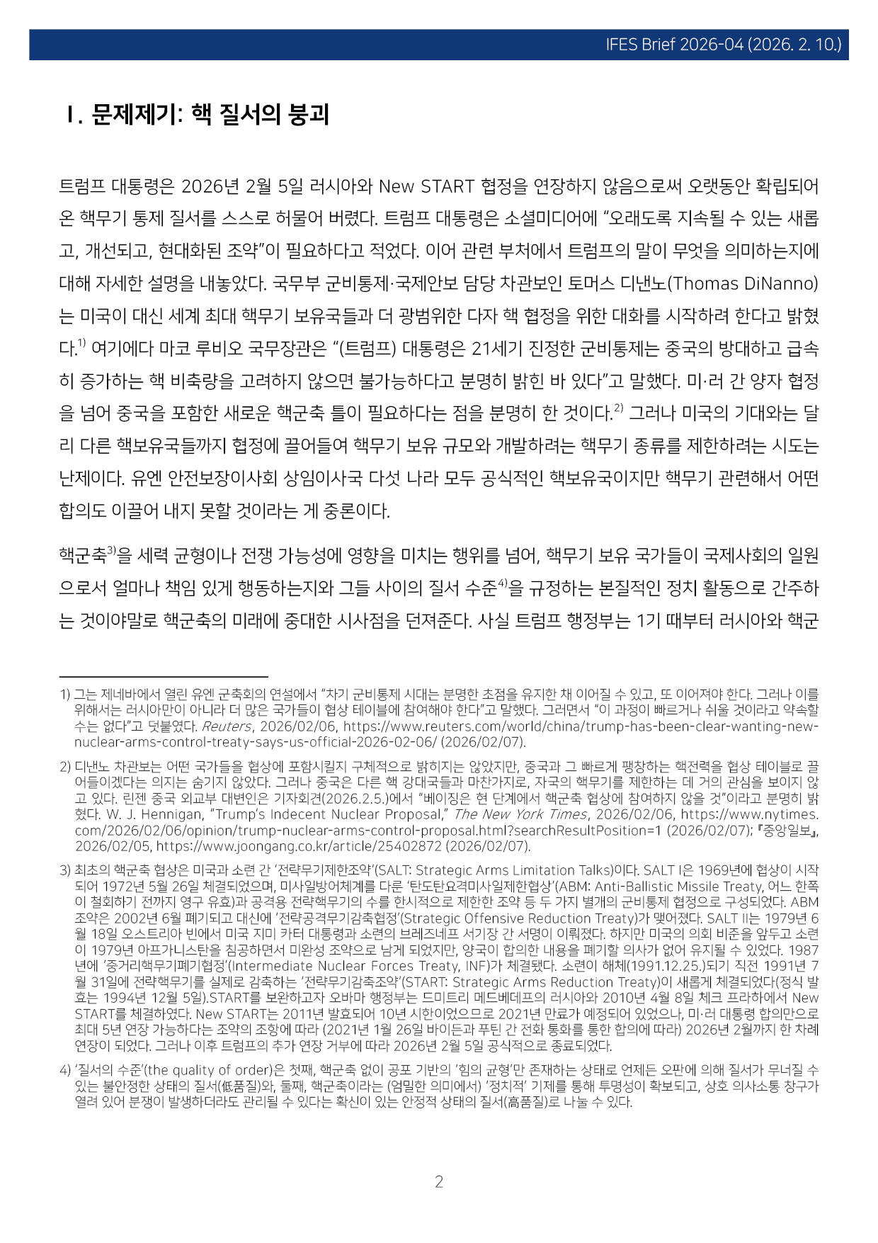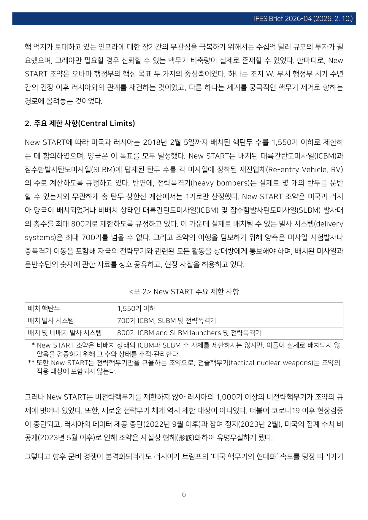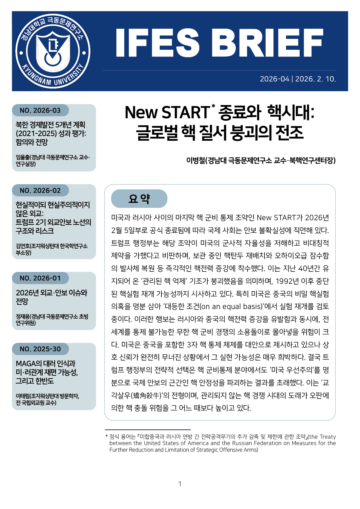 컨텐츠영역 fnctId=material,fnctNo=0 New START 종료와 핵시대: 글로벌 핵 질서 붕괴의 전조 항목 저자 이병철(경남대 극동문제연구소 교수 북핵연구센터장) 일련번호 [IFESBrief_2026-04] 발행일 2026-02-10 자료보기