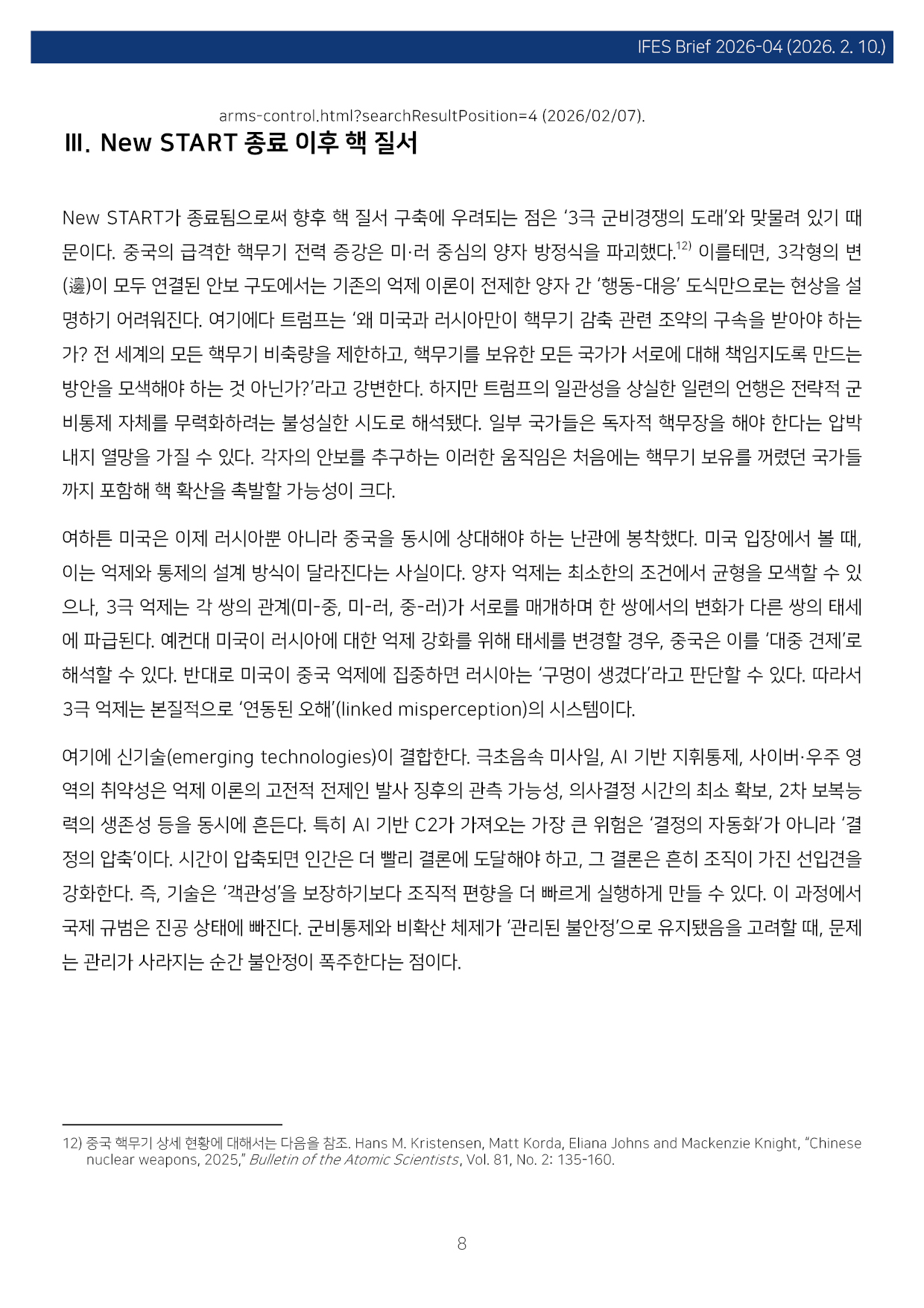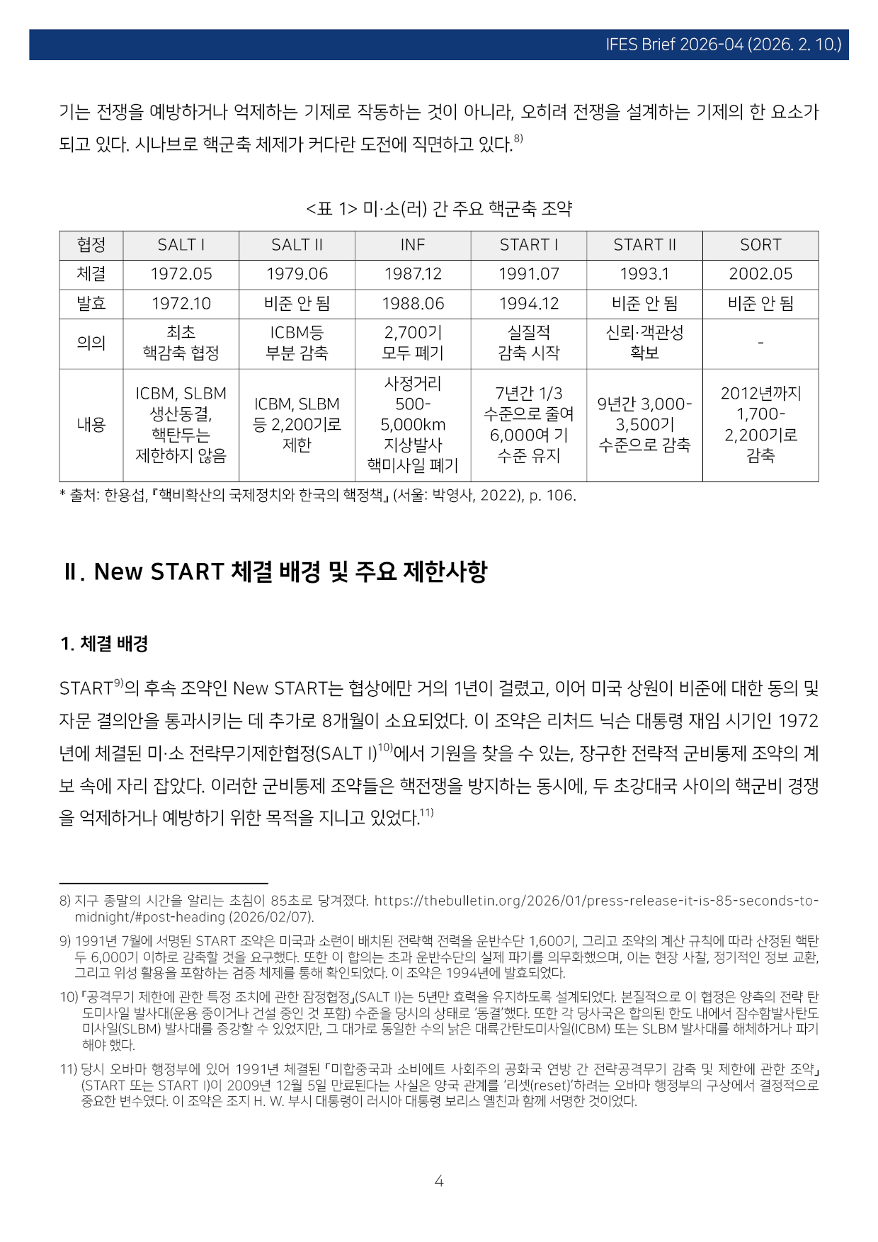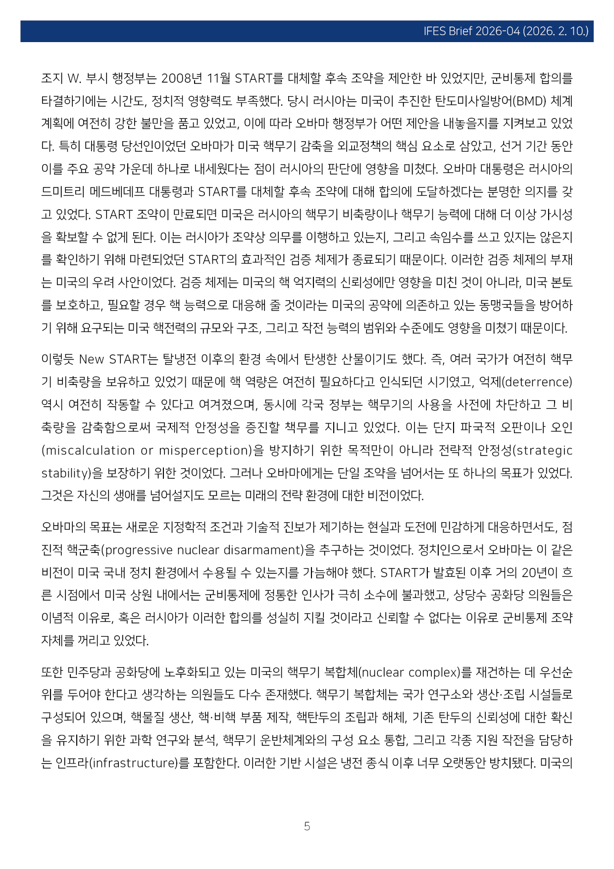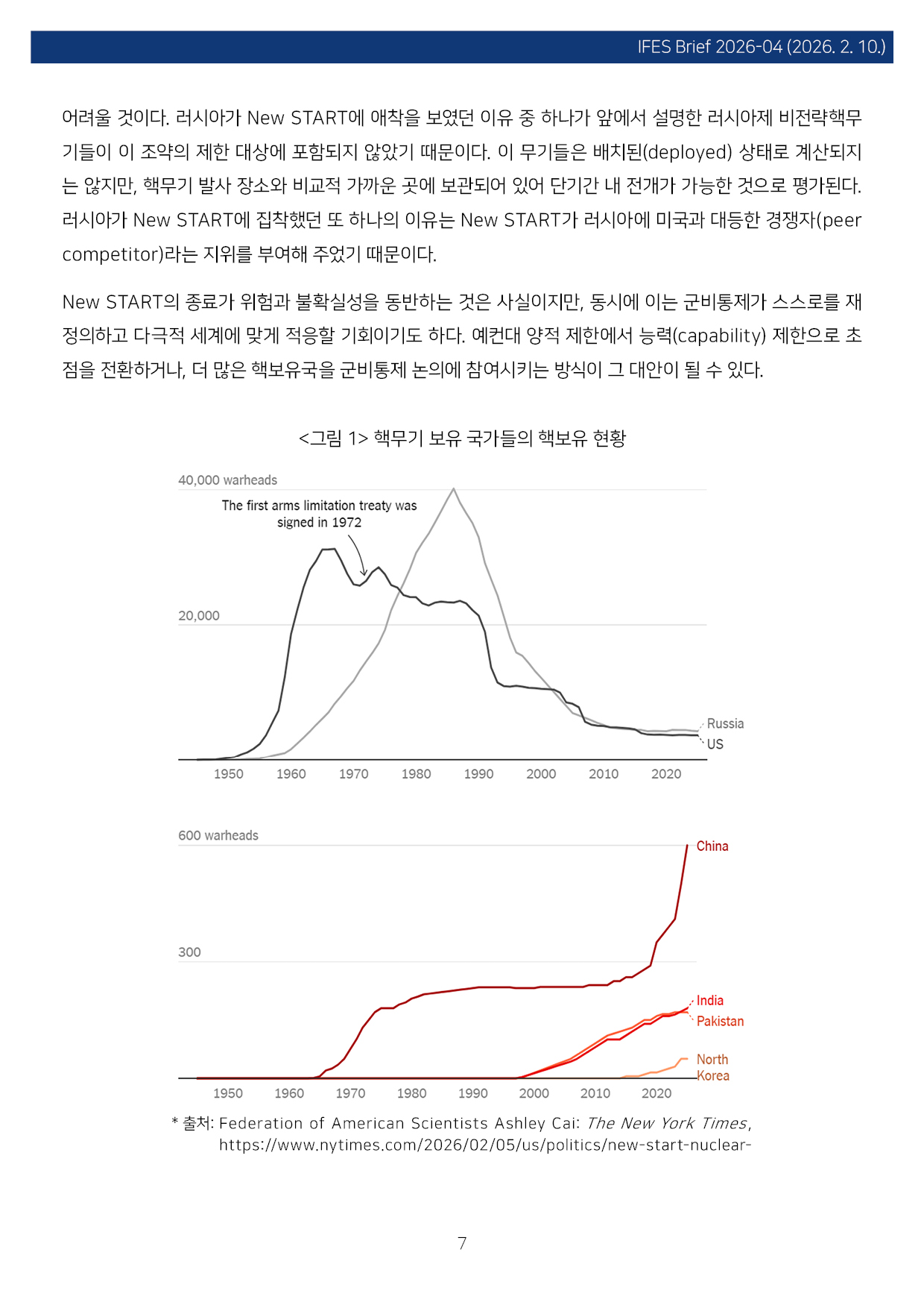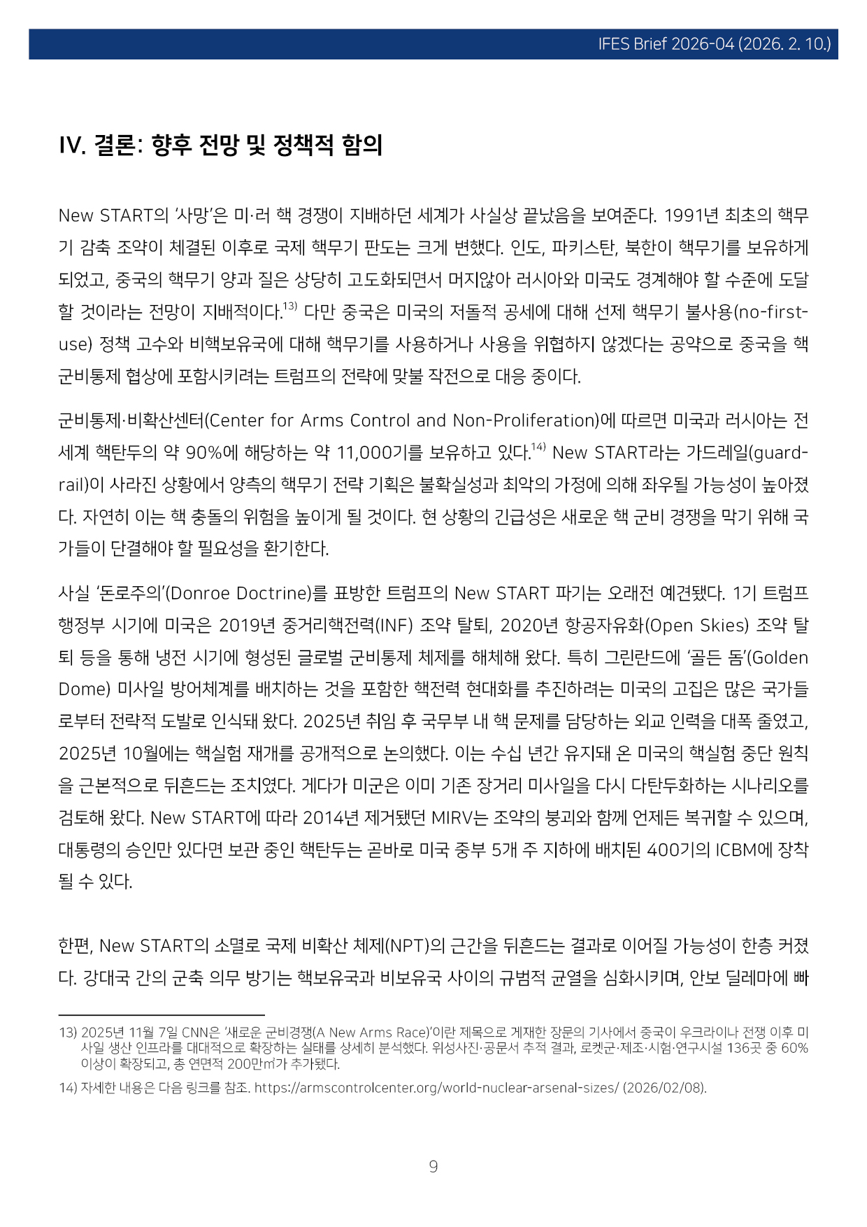 컨텐츠영역 fnctId=material,fnctNo=0 New START 종료와 핵시대: 글로벌 핵 질서 붕괴의 전조 항목 저자 이병철(경남대 극동문제연구소 교수 북핵연구센터장) 일련번호 [IFESBrief_2026-04] 발행일 2026-02-10 자료보기