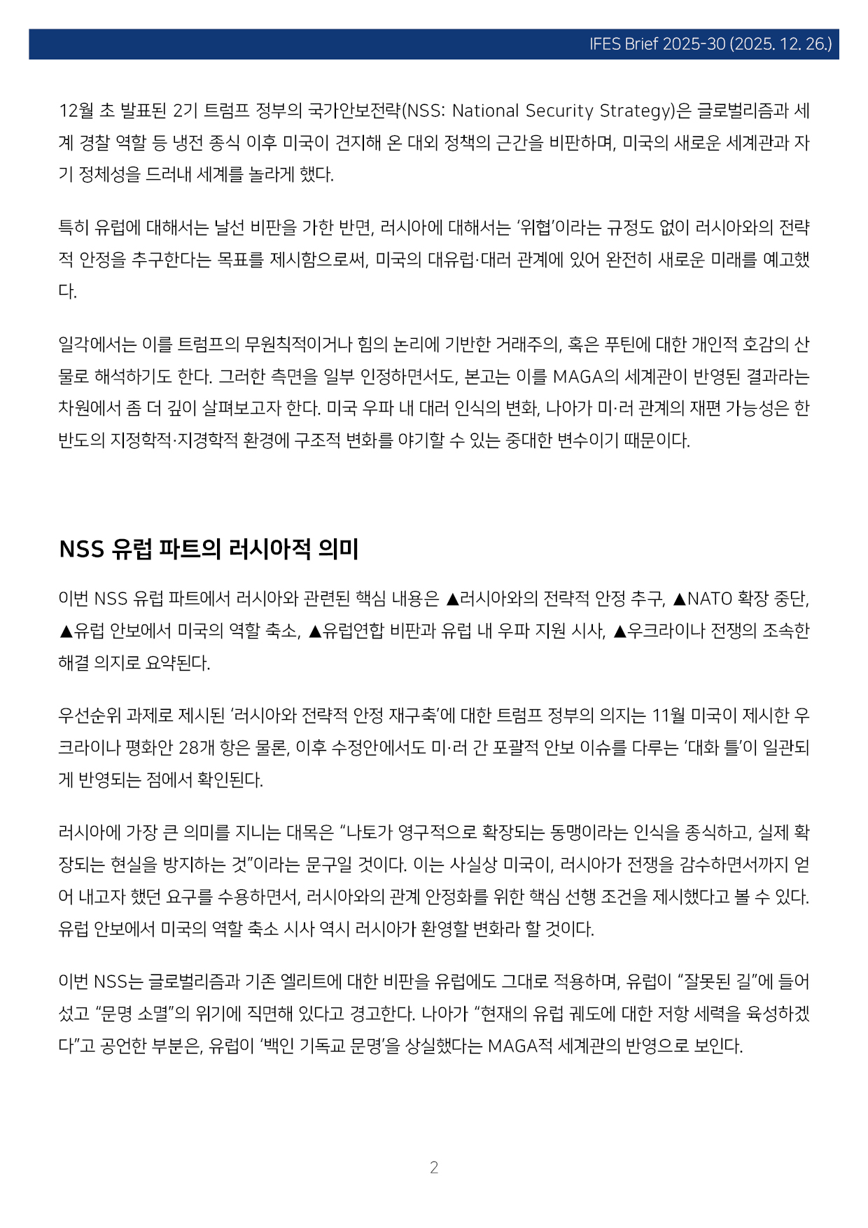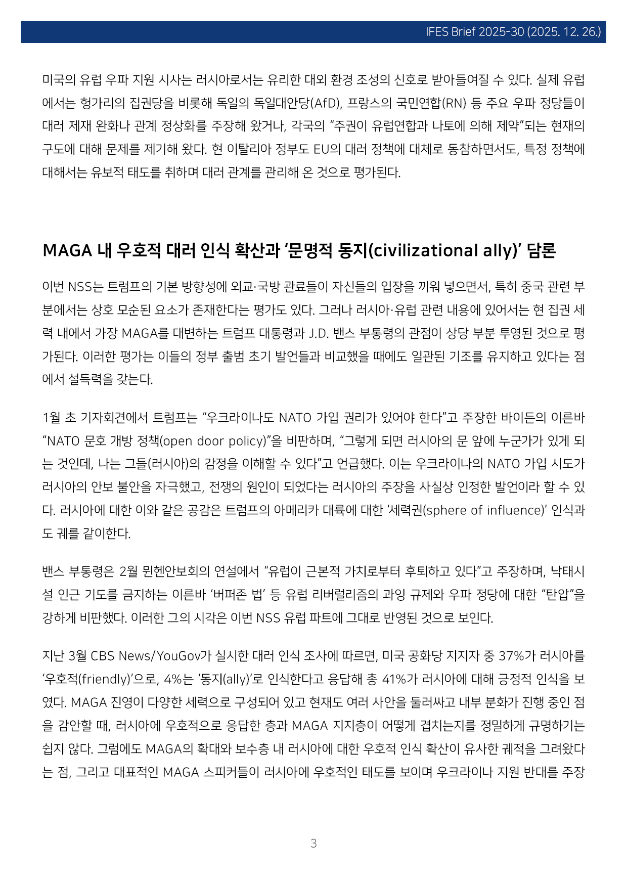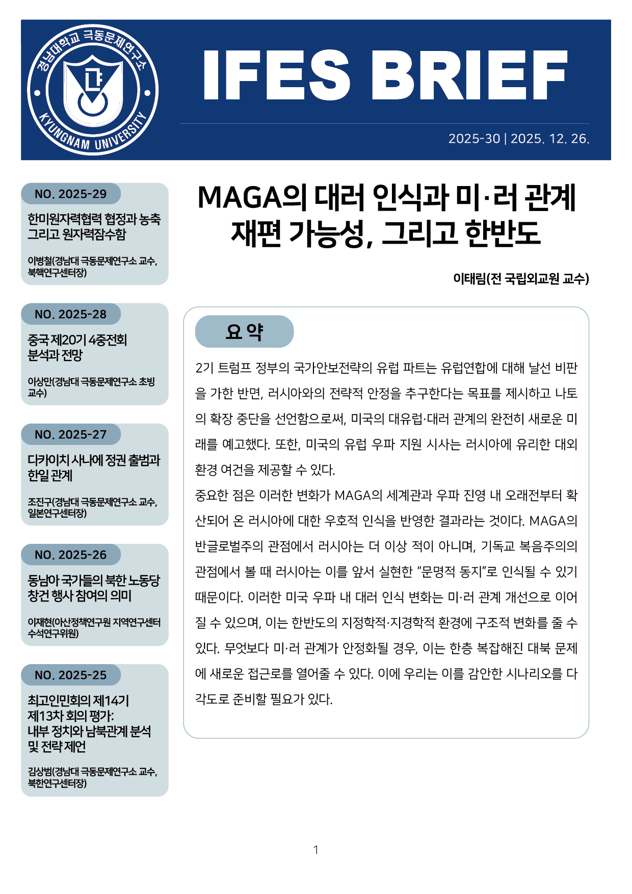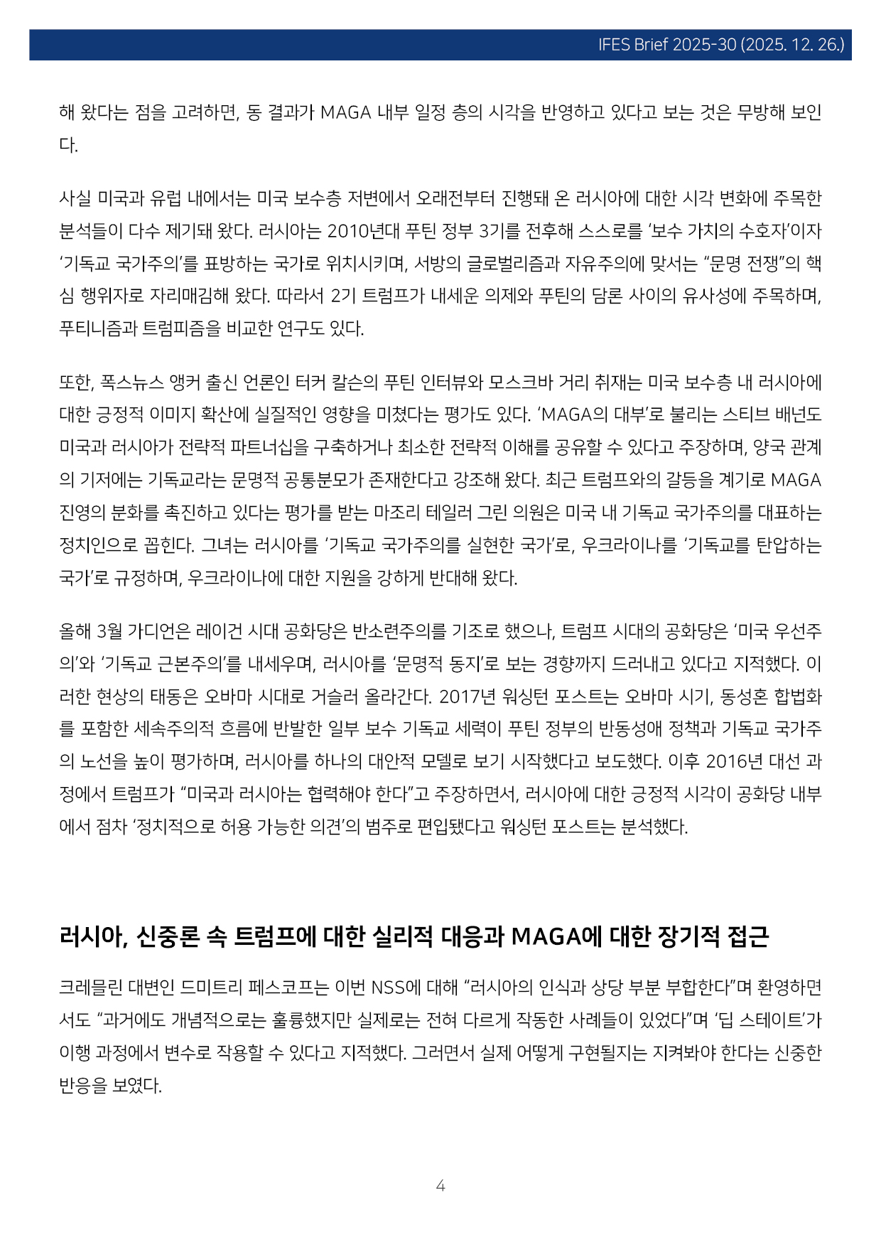 컨텐츠영역 fnctId=material,fnctNo=0 MAGA의 대러 인식과 미·러 관계 재편 가능성, 그리고 한반도 항목 저자 이태림(전 국립외교원 교수 ) 일련번호 [IFESBrief_2025-30] 발행일 2025-12-26 자료보기