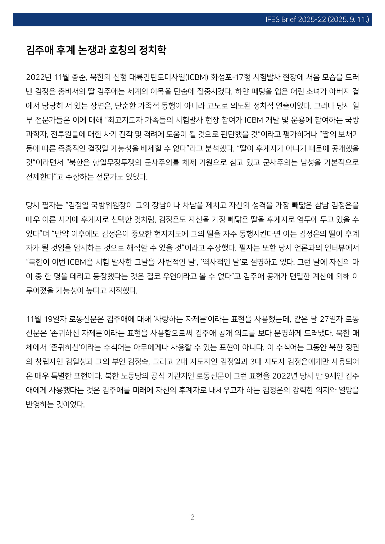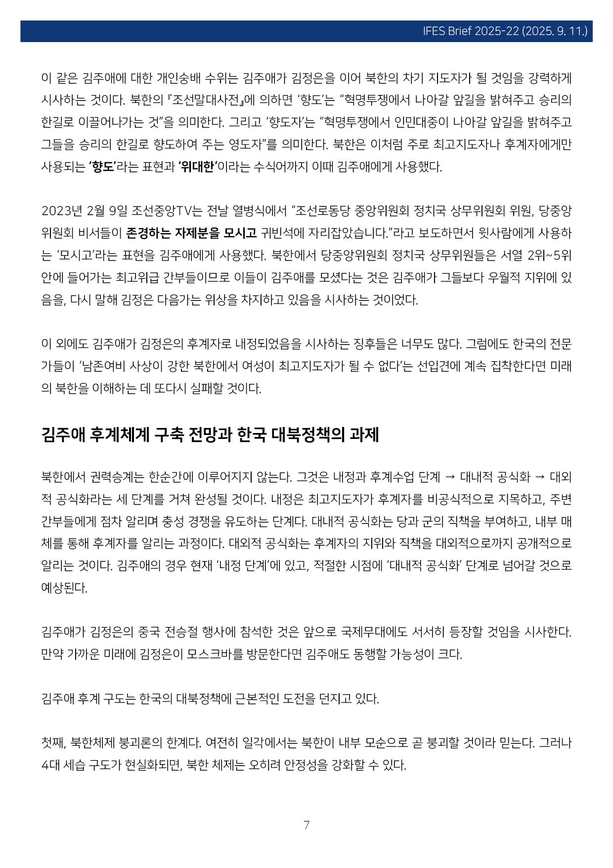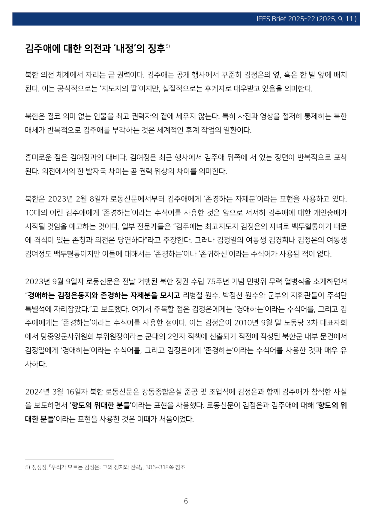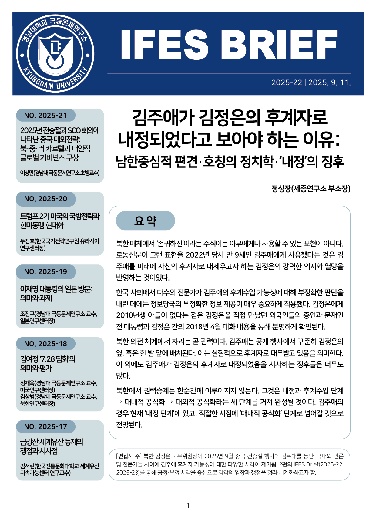 컨텐츠영역 fnctId=material,fnctNo=0 김주애가 김정은의 후계자로 내정되었다고 보아야 하는 이유: 남한중심적 편견·호칭의 정치학·‘내정’의 징후 항목 저자 정성장(세종연구소 부소장) 일련번호 [IFESBrief_2025-22] 발행일 2025-09-11 자료보기