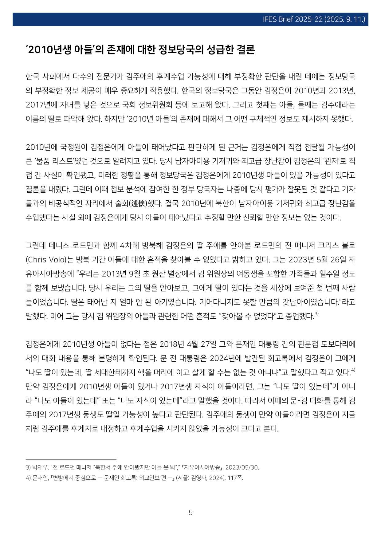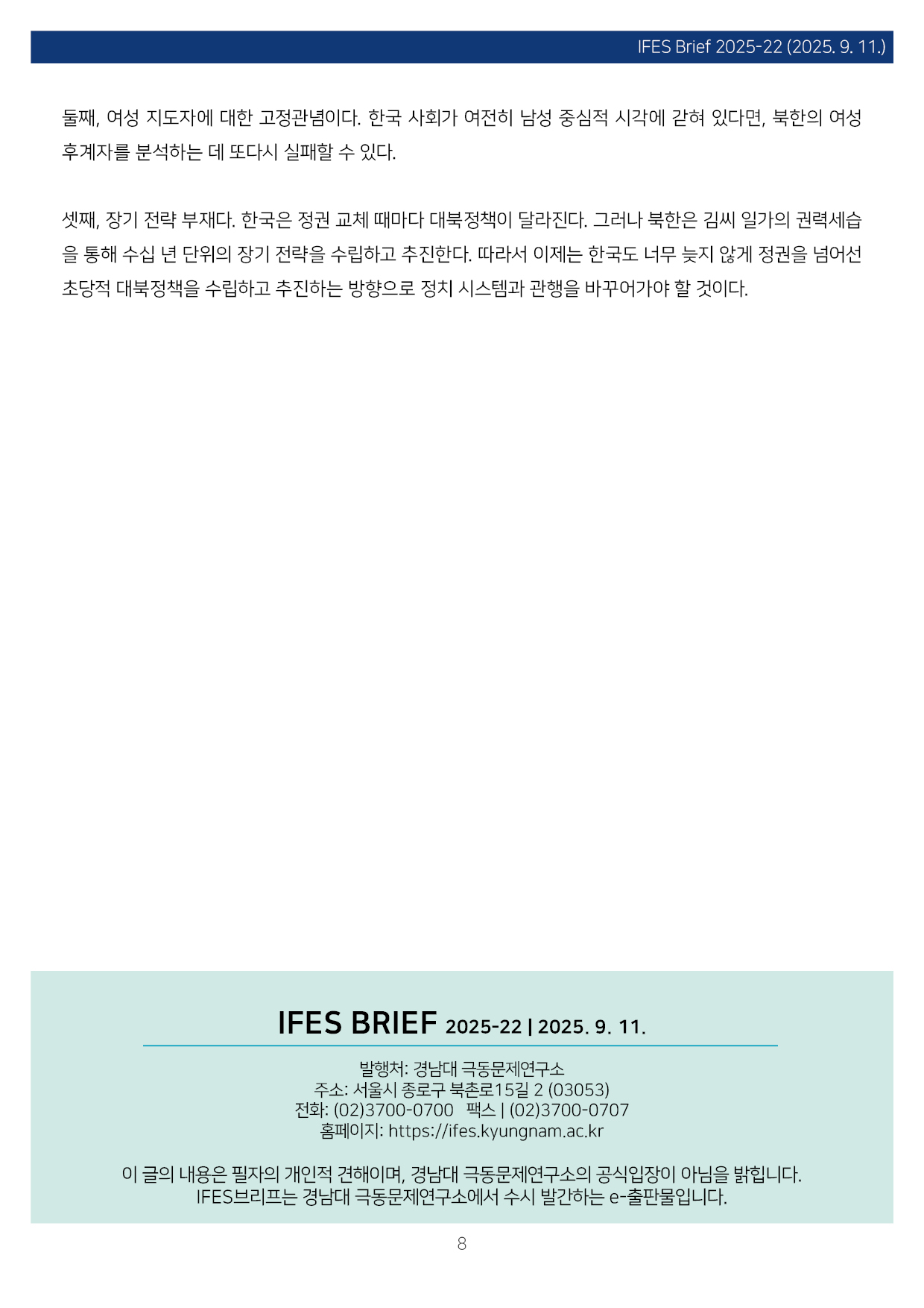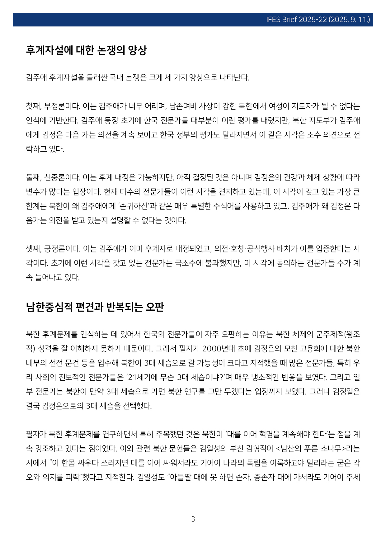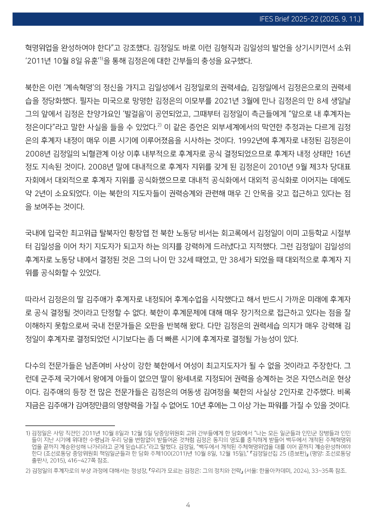 컨텐츠영역 fnctId=material,fnctNo=0 김주애가 김정은의 후계자로 내정되었다고 보아야 하는 이유: 남한중심적 편견·호칭의 정치학·‘내정’의 징후 항목 저자 정성장(세종연구소 부소장) 일련번호 [IFESBrief_2025-22] 발행일 2025-09-11 자료보기