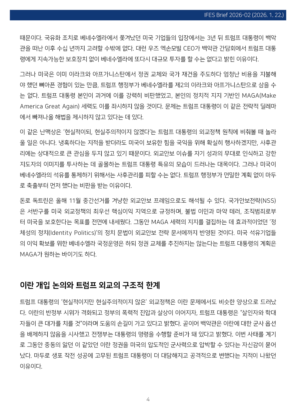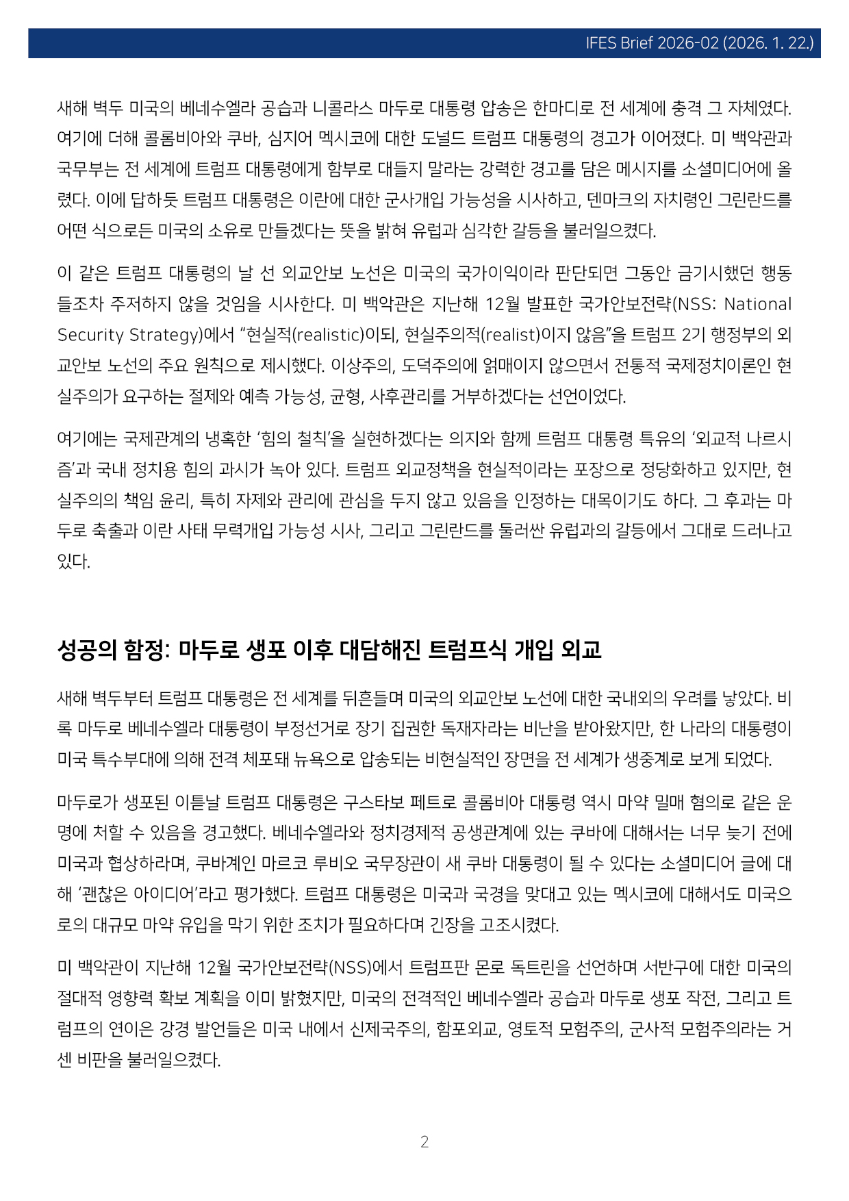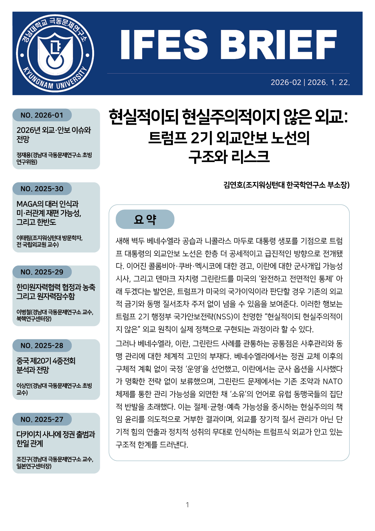 컨텐츠영역 fnctId=material,fnctNo=0 현실적이되 현실주의적이지 않은 외교: 트럼프 2기 외교안보 노선의 구조와 리스크 항목 저자 김연호(조지워싱턴대 한국학연구소 부소장) 일련번호 [IFESBrief_2026-02] 발행일 2026-01-22 자료보기
