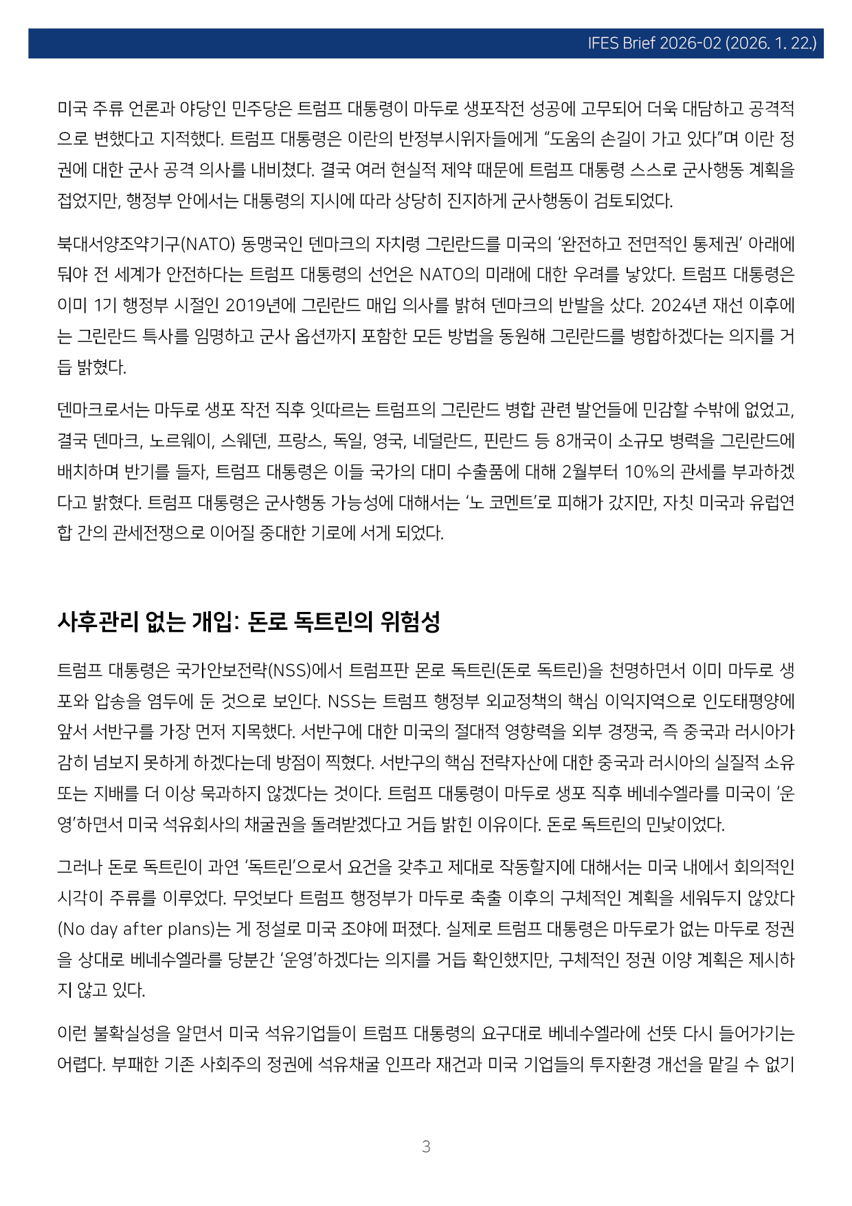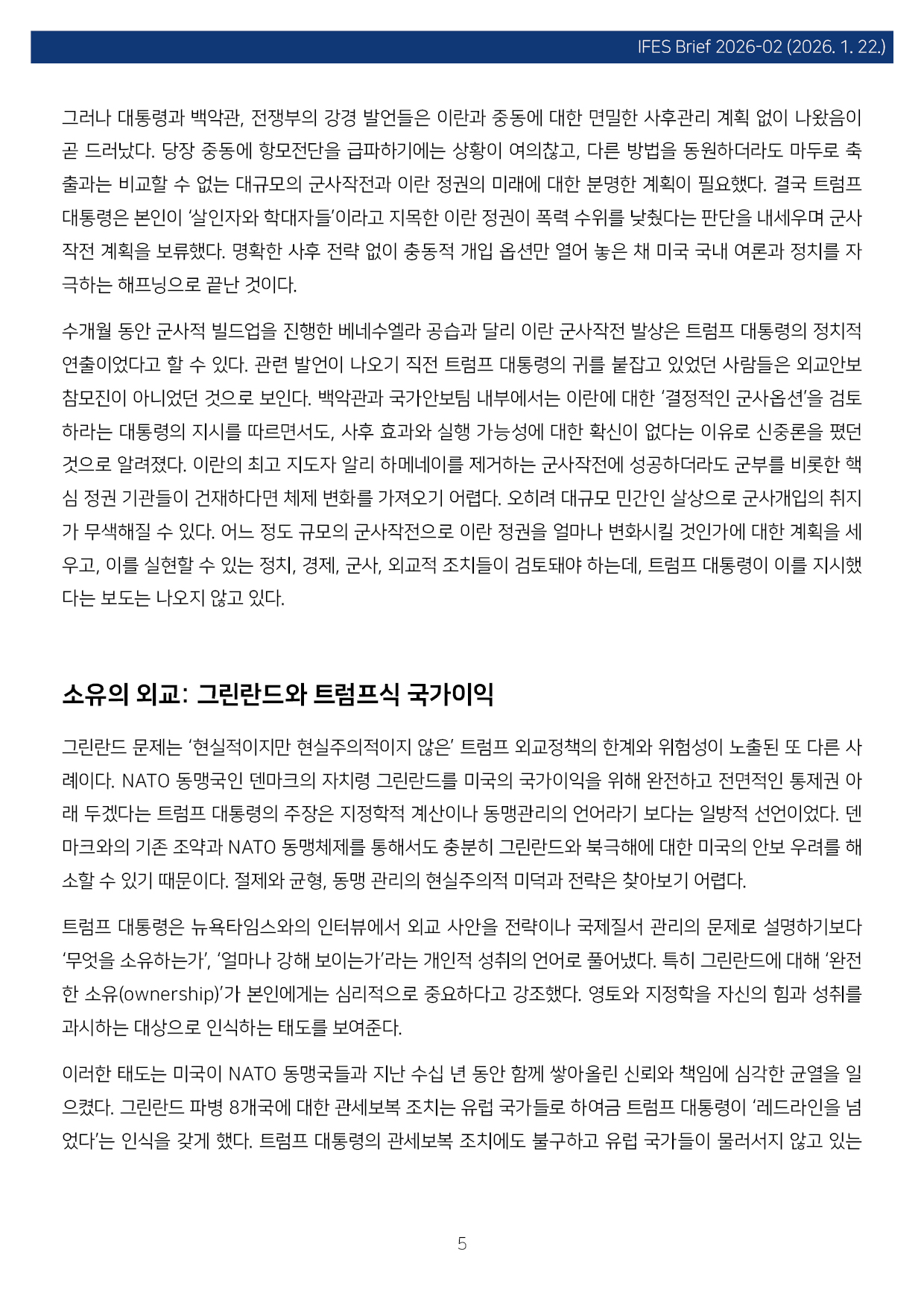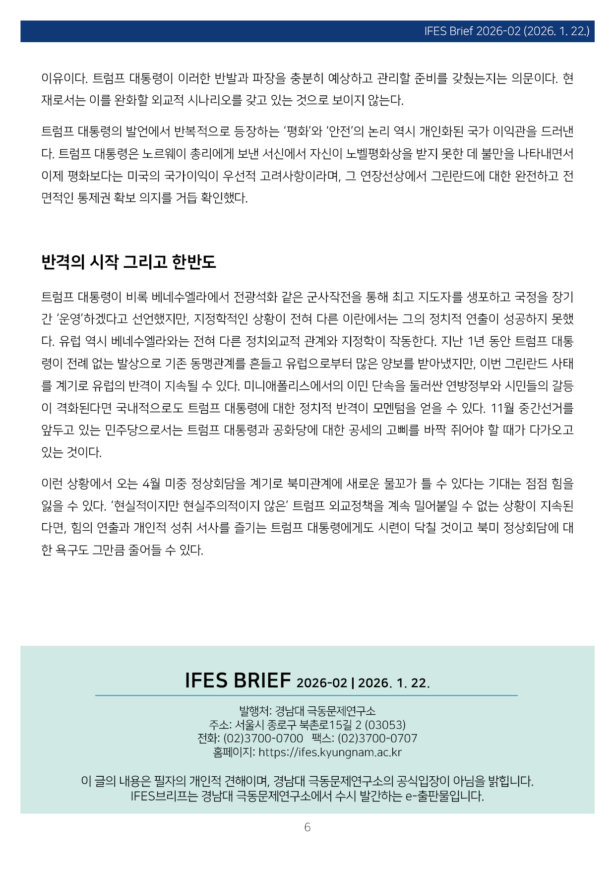 컨텐츠영역 fnctId=material,fnctNo=0 현실적이되 현실주의적이지 않은 외교: 트럼프 2기 외교안보 노선의 구조와 리스크 항목 저자 김연호(조지워싱턴대 한국학연구소 부소장) 일련번호 [IFESBrief_2026-02] 발행일 2026-01-22 자료보기