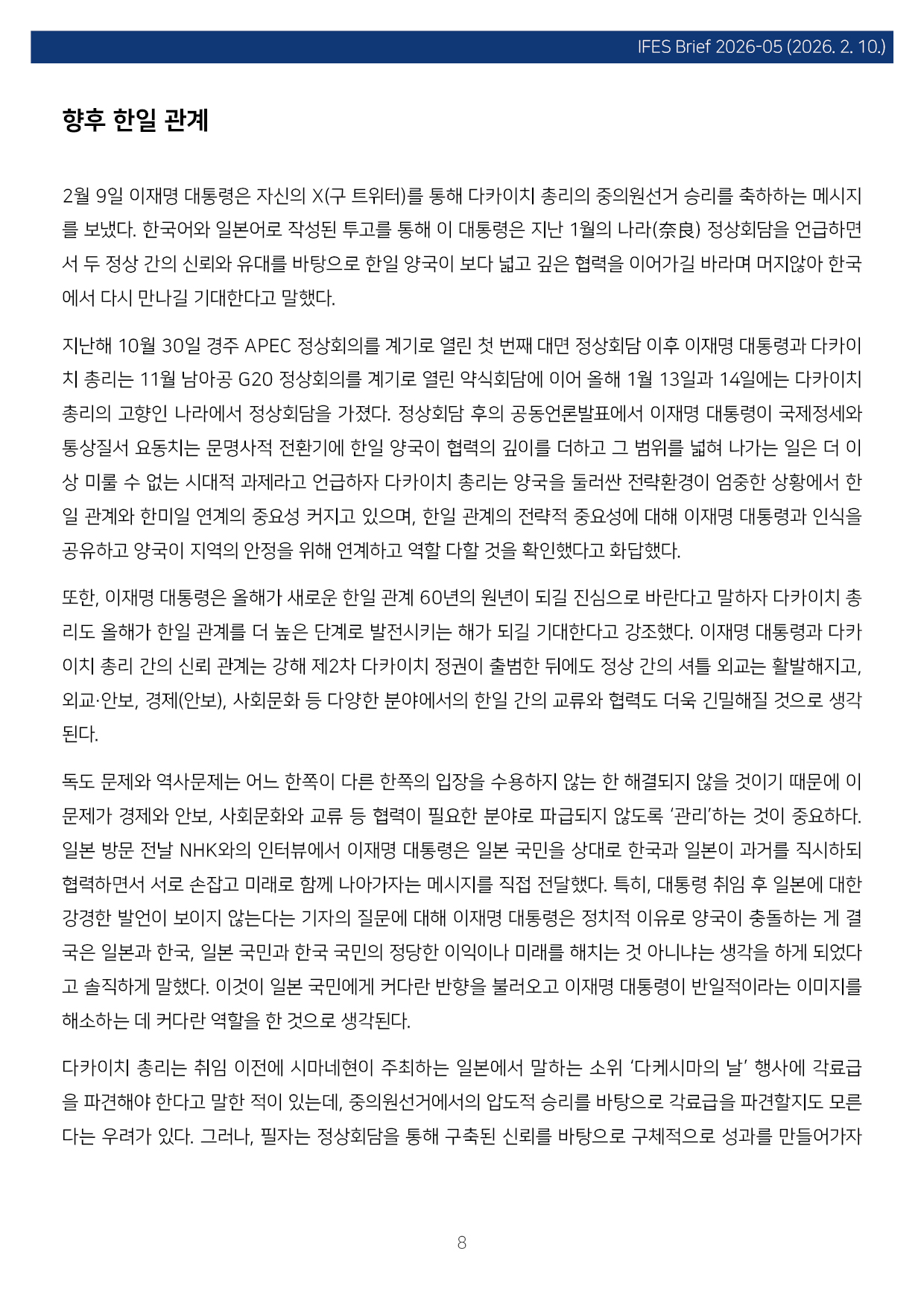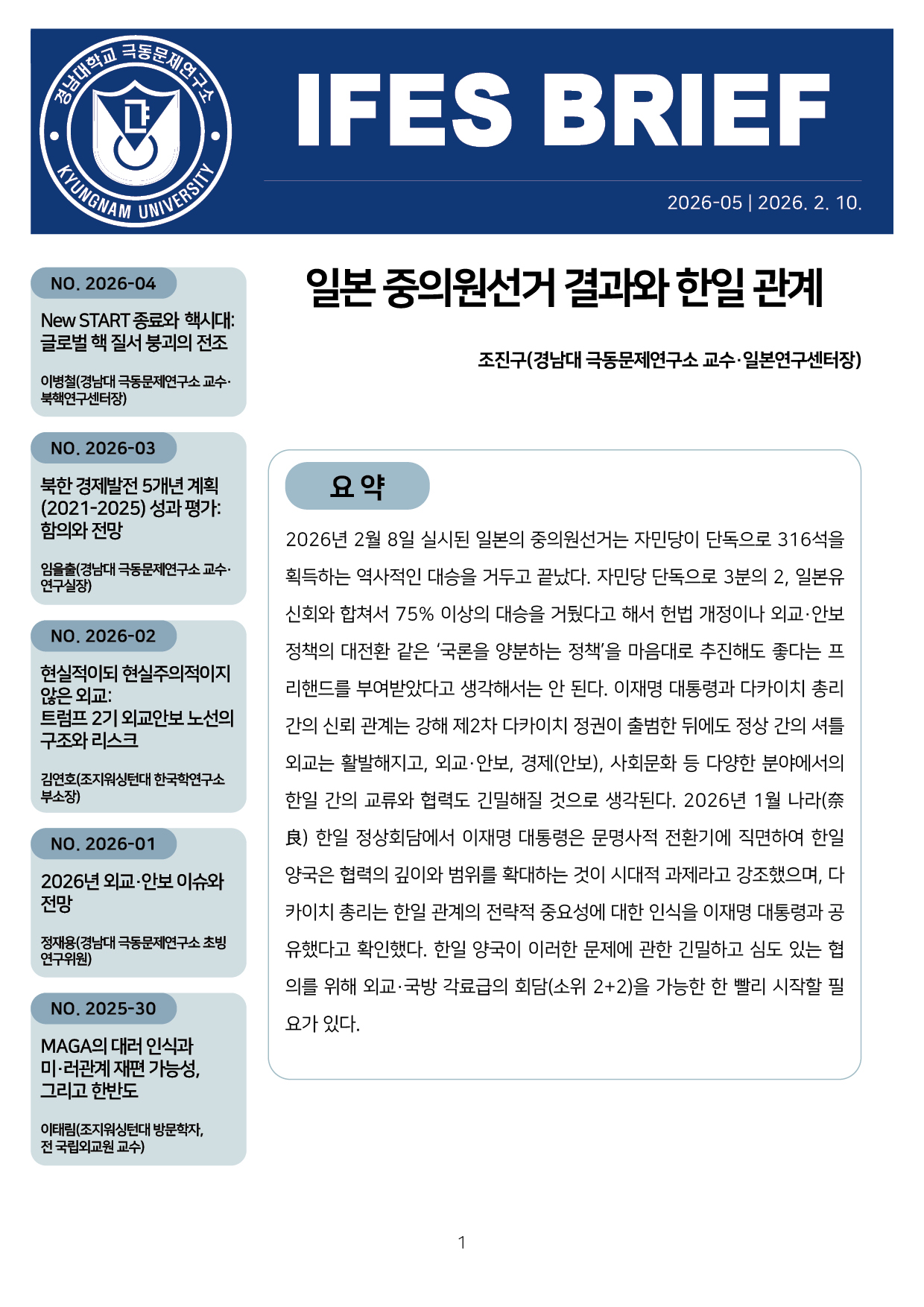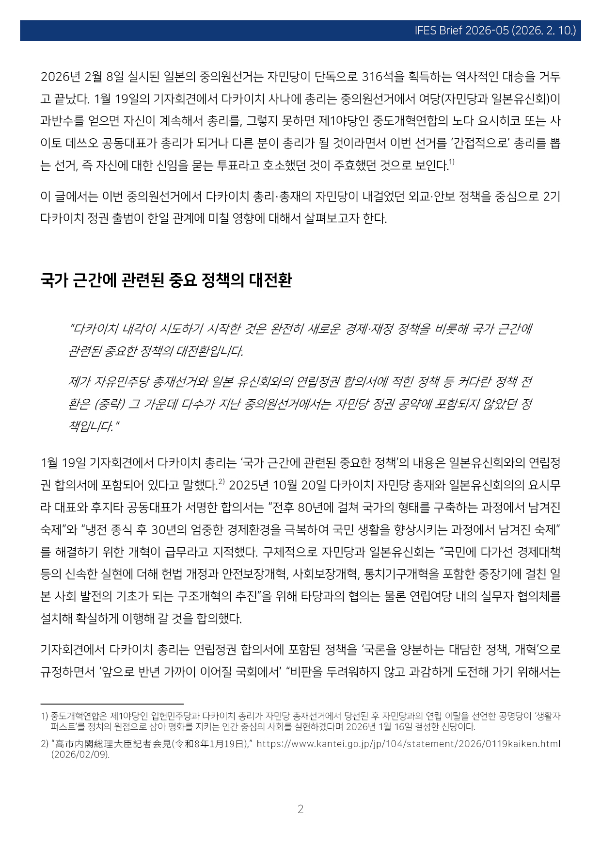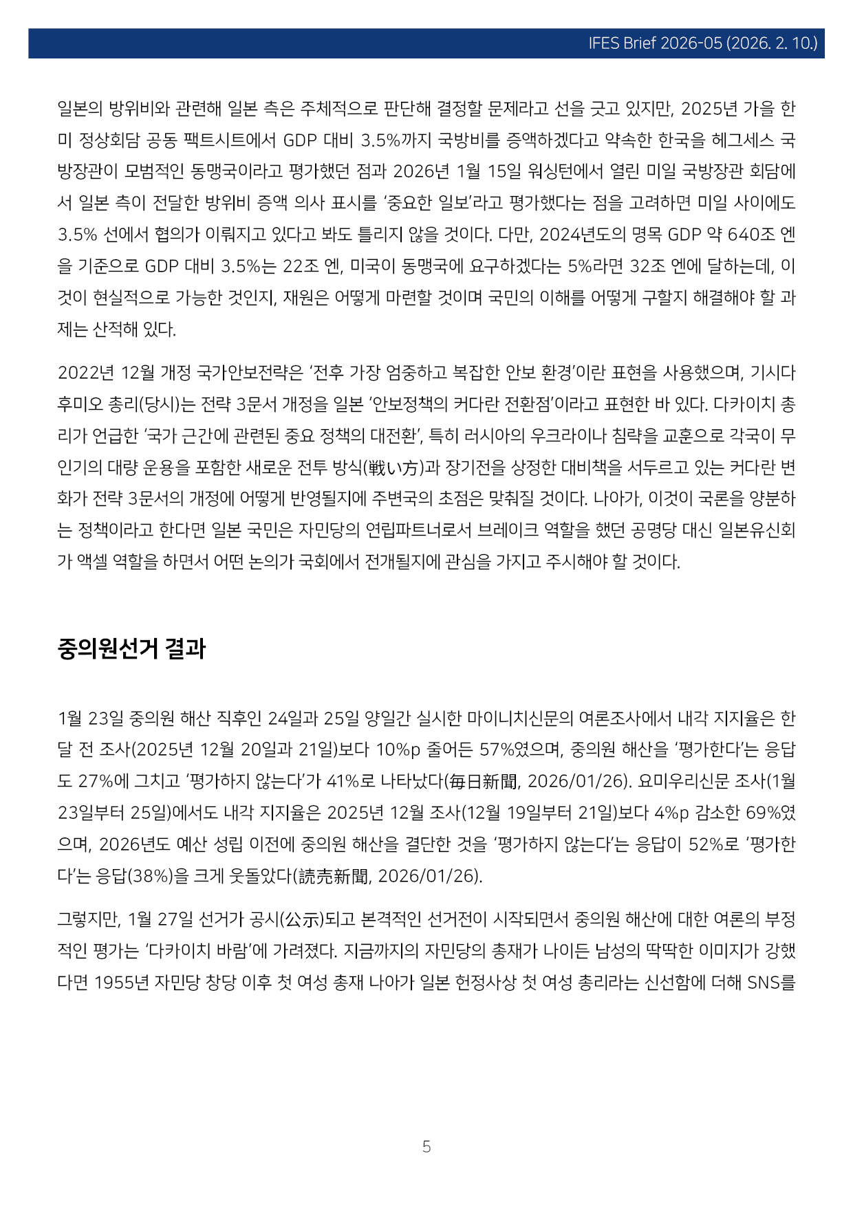 컨텐츠영역 fnctId=material,fnctNo=0 일본 중의원선거 결과와 한일 관계 항목 저자 조진구(경남대 극동문제연구소 교수 일본연구센터장) 일련번호 [IFESBrief_2026-05] 발행일 2026-02-10 자료보기