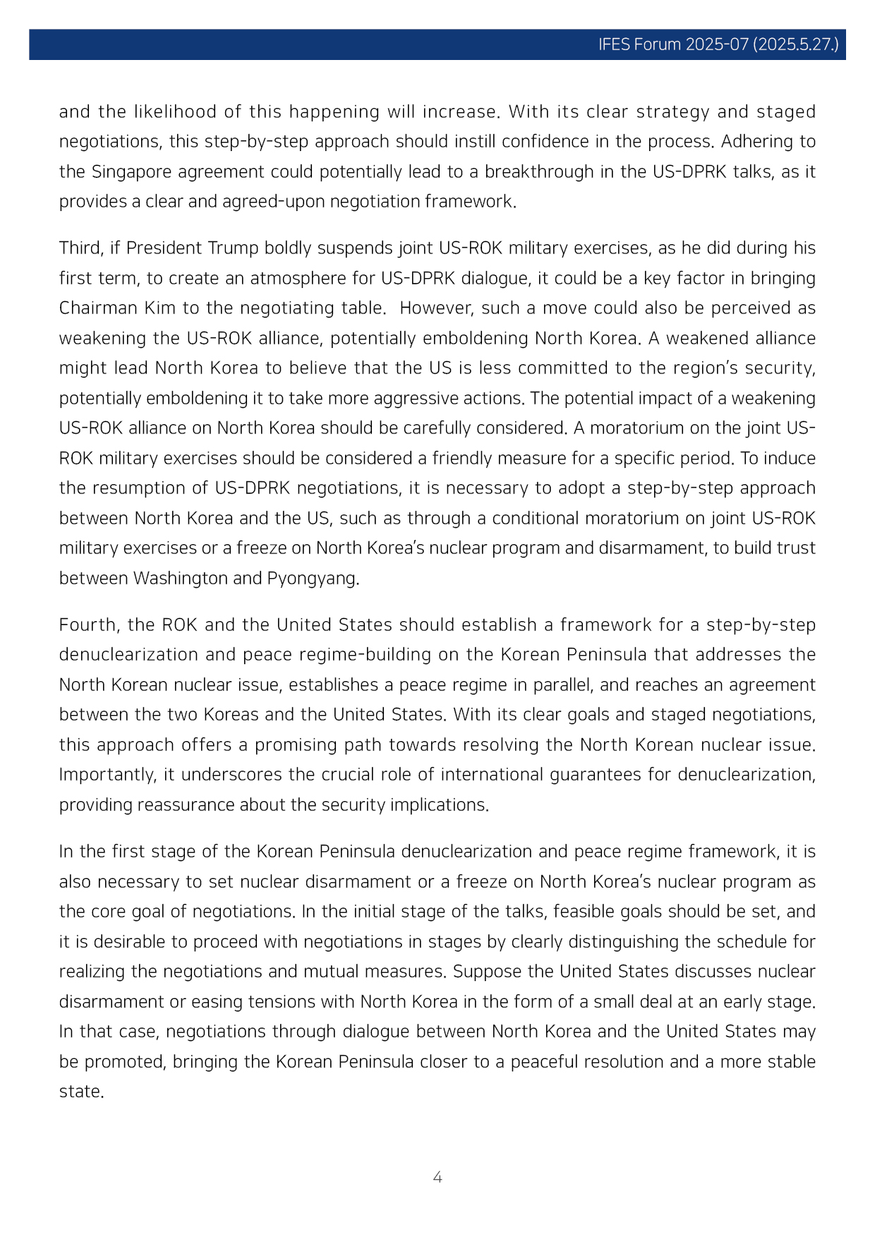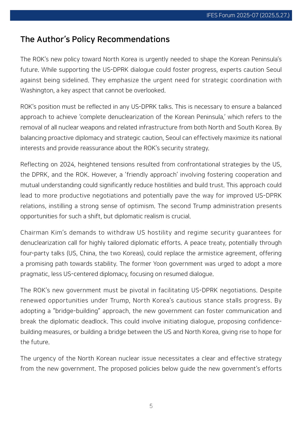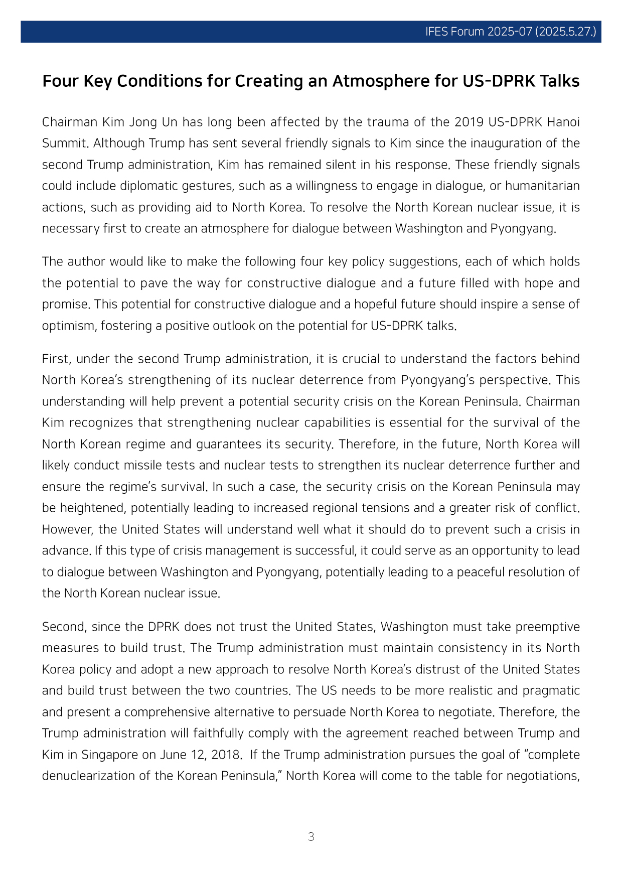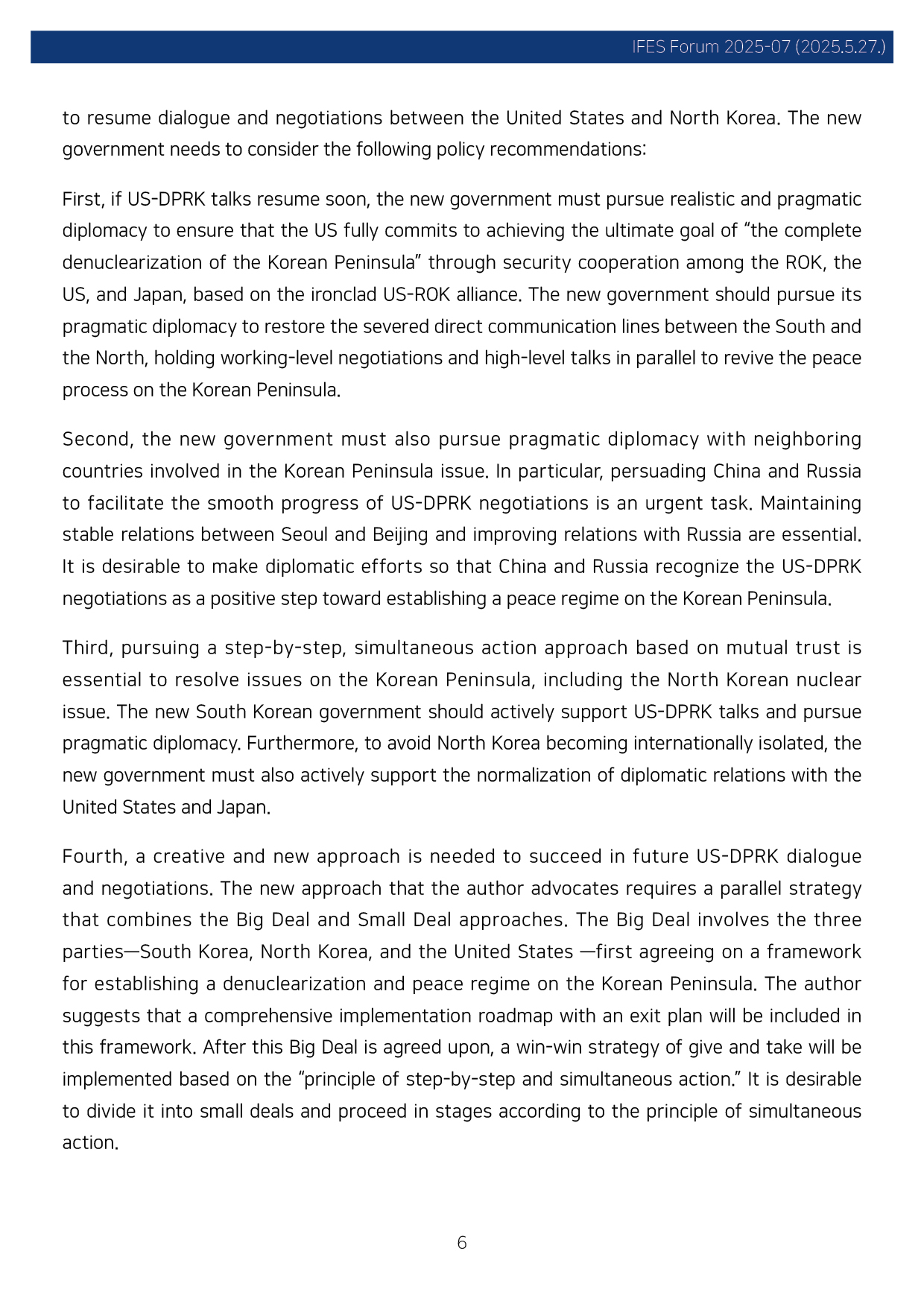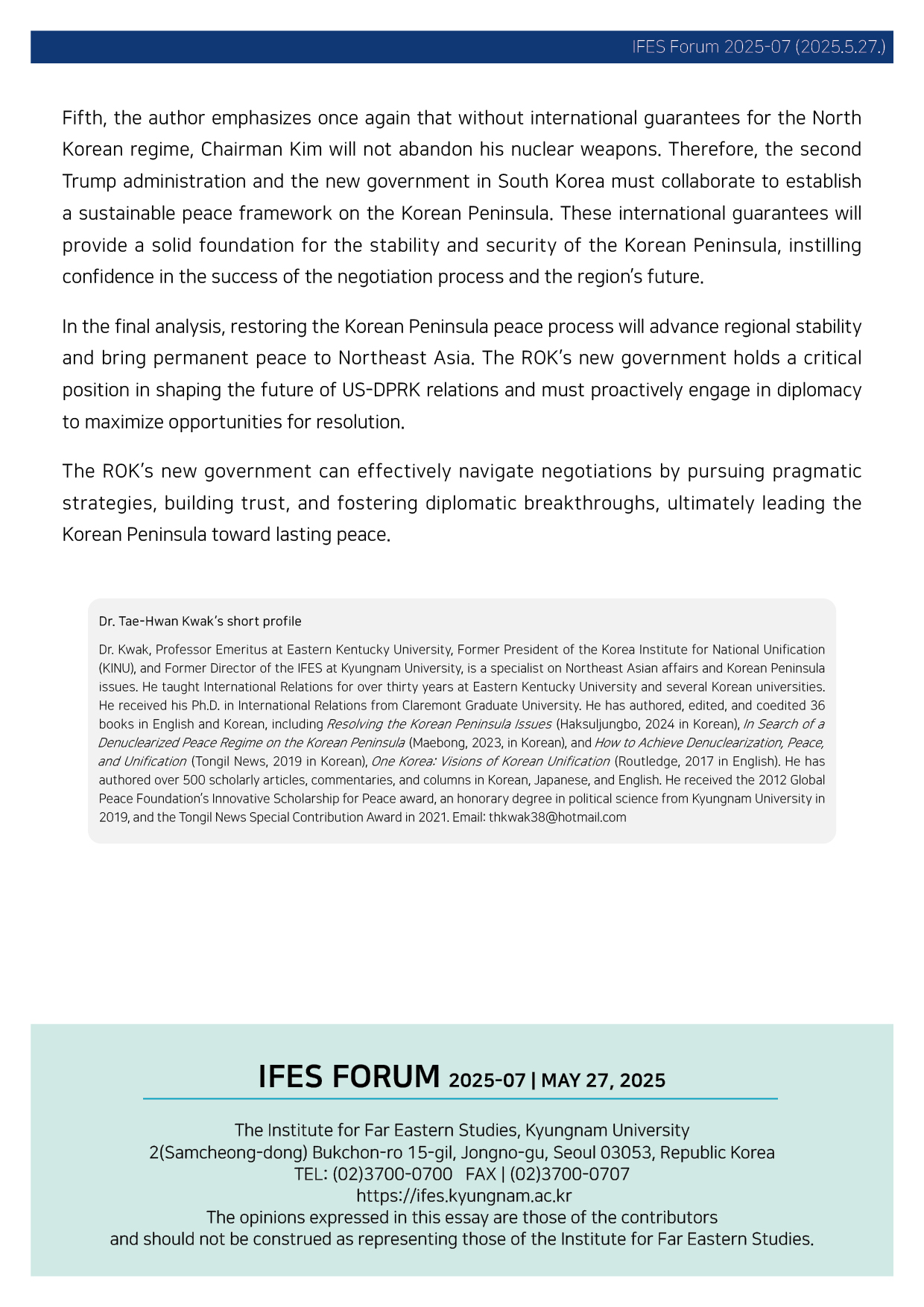 컨텐츠영역 fnctId=mtrl,fnctNo=11 [IFES Forum] What Should the ROK’s New Government Do to Shape the Future of US-DPRK Relations? 항목 Date 2025-05-27 Author Tae-Hwan Kwak, Ph. D.[Former President, Korea Institute for National Unification / Professor Emeritus, Eastern Kentucky University] Article No. IFESForum_2025-07 PDF File